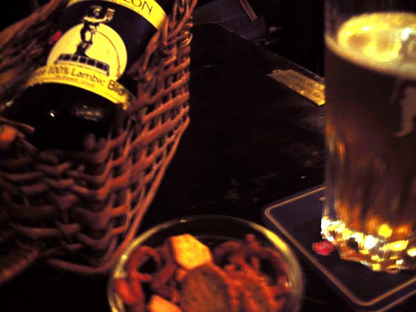 And to keep the theme of lambics, my first beer at Poeche was a lambic. Here, you see the traditional way of serving lambic from bottle. The waiter brings the opened bottle in a little wicker basket. Also, traditionally with your beer in a brown cafe, you'll get a little snack. Here a cracker mix, often small cubes of cheese and celery salt.