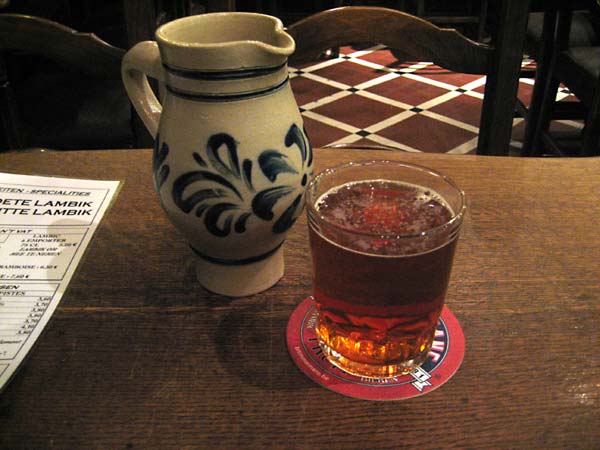 Around the corner and down an even smaller, less well marked alley is La Bécasse, a very old traditional cafe that specializes in products from the Timmerman's brewery. Pictured here is the Labik Doux, served in the traditional stoneware pitcher that you would have seen beer in the olden days.
