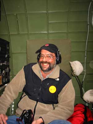 On our first trip, Bill and I grabbed some cushions in the navigator's room. You can see the vintage radio equipment to Bill's right. Since we ended up next to the engines,