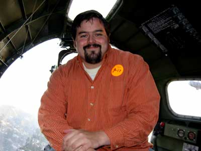 My hair's a little mussed from the breeze looking out over the plane. When you sit in the bombardier's chair and look out through